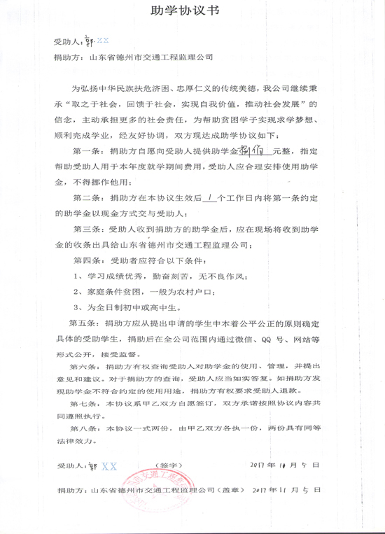 在此基礎(chǔ)上,我們認(rèn)為公司還能做得更好更多,優(yōu)秀企業(yè)對社會的信譽(yù)不應(yīng)該停留在提供關(guān)注本身的層面上,而應(yīng)該通過承擔(dān)更多的社會責(zé)任、幫助需要的社會群體實(shí)現(xiàn)公司更大價(jià)值,也為員工自我價(jià)值的提升提供一個(gè)平臺。樂善好施、扶貧幫困是中華民族的傳統(tǒng)美德;相互幫助、患難扶持是社會倡導(dǎo)的時(shí)代新風(fēng)。它既體現(xiàn)了人類最高尚的品質(zhì)、最美好的情感和道德情操,又是社會文明與進(jìn)步的標(biāo)志。帶著對這一份理解,監(jiān)理公司決定在全公司范圍內(nèi)發(fā)起倡議,用我們的愛心,竭盡全力圓新生力量的“讀書夢”。我們將為條件家庭困難的莘莘學(xué)子提供讀書條件,幫助他們順利完成學(xué)業(yè)。